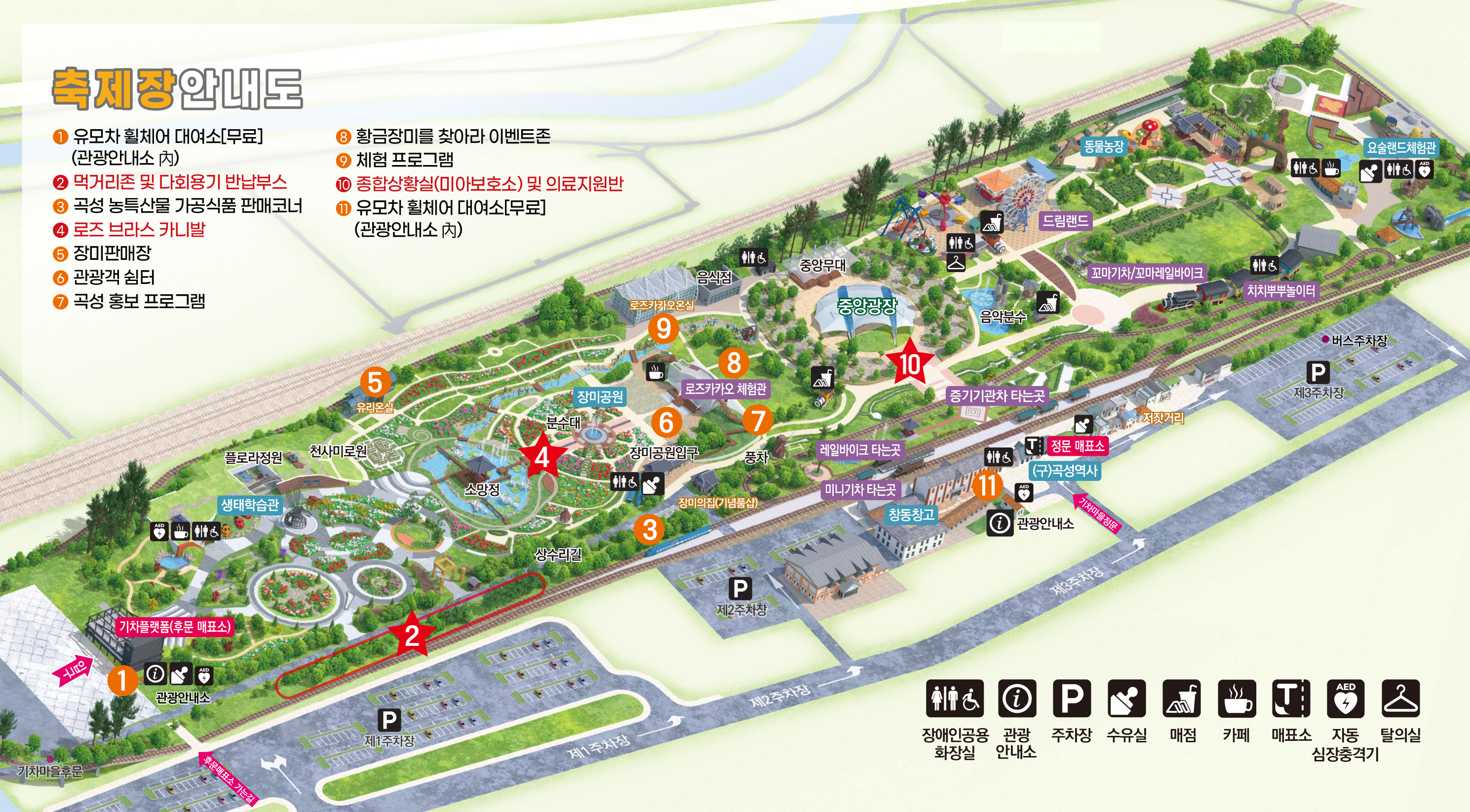 1. 증기기관차 탑승 체험 2. 곡성 장미공원 산책 3. 어린이 놀이기구 체험존 4. 전통시장 먹거리존 5. 버스킹 공연 및 플래시몹 이벤트 6. 가족 단위 포토존 및 기차 모형 촬영